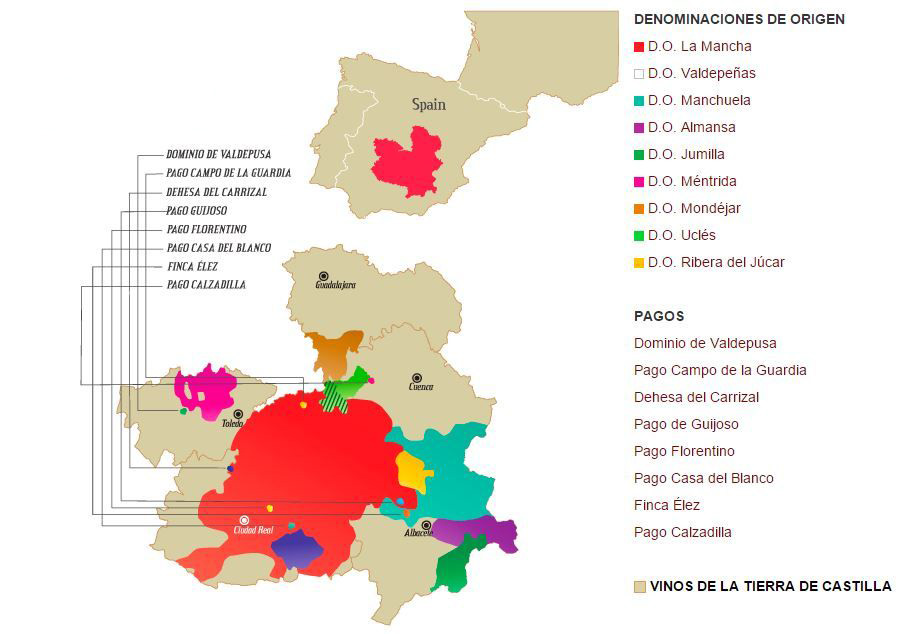 En lo que a sus denominaciones de origen se refiere, en Castilla-La Mancha conviven las dos más populares y numerosas, D.O. Valdepeñas y D.O. La Mancha, con otras ocho de perfil muy diverso y alguna bien pequeña. Las de menor extensión y producción, y por ende, más centradas en el mercado regional, son Uclés, Manchuela, Almansa, Méntrida, Jumilla (compartida con la comunidad murciana), Mondéjar y Ribera del Júcar; más la ya referida recién llegada Campo de Calatrava, una comarca con historia de campos de origen volcánica y denominación que arranca con seis bodegas.